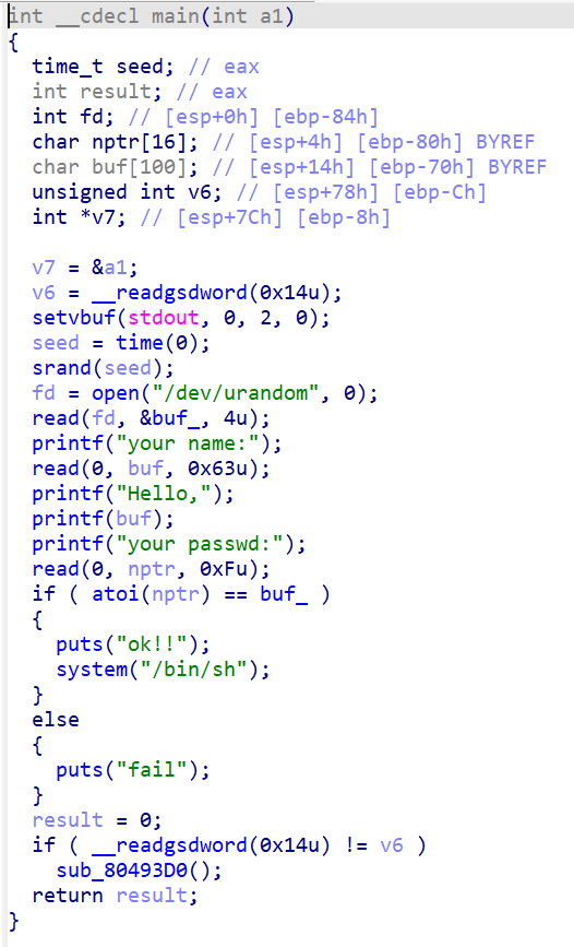 buf只能存32字节,但是read让你能够读256字节的数据,显然是一个栈溢出类型的漏洞
