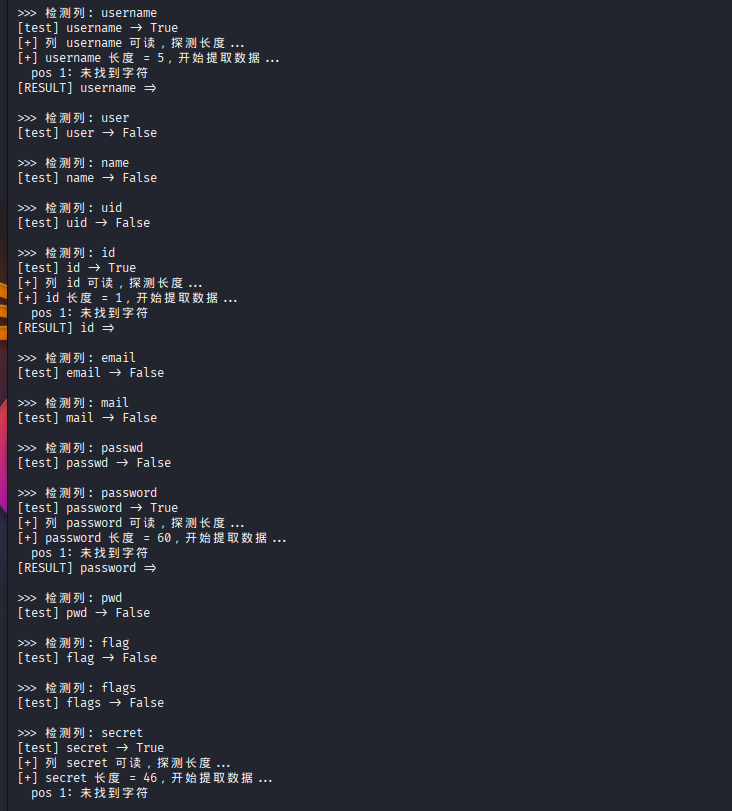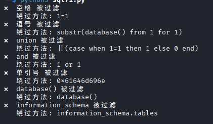 查询看一下为真为假的返回是什么,用一下'or'1'='1发现永真存在永假返回查不到,写一个脚本看一下常见的字符过滤了什么